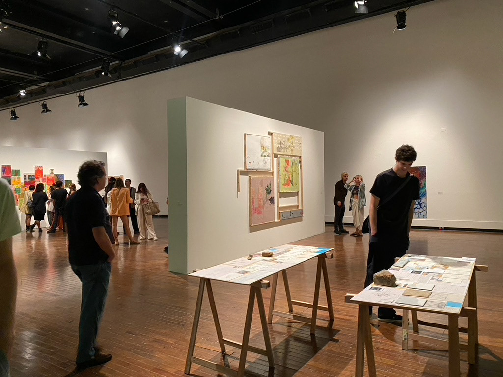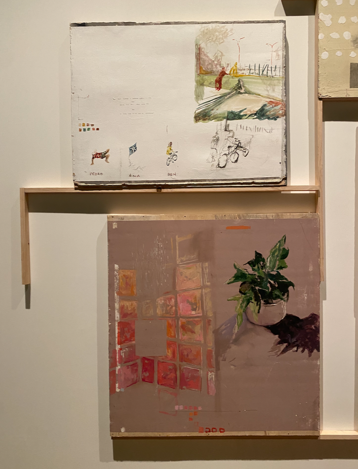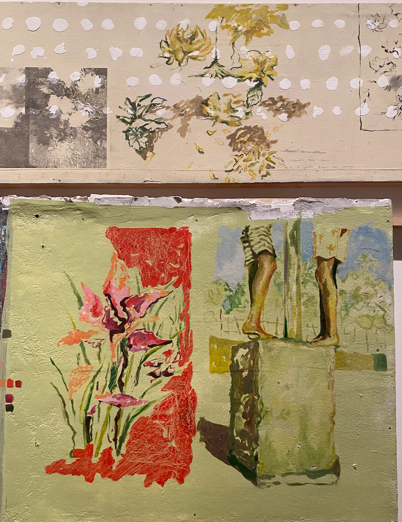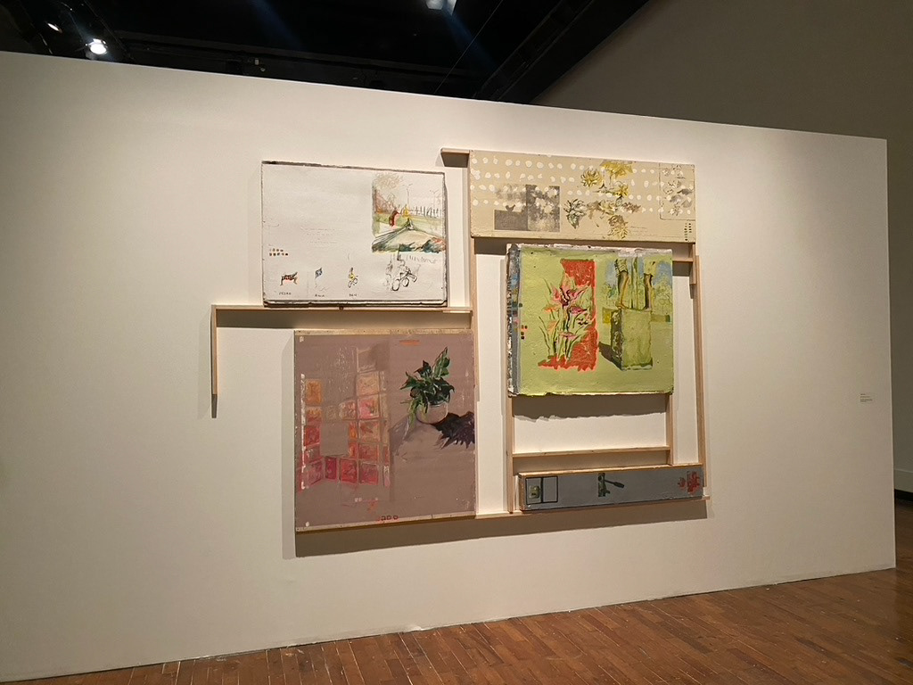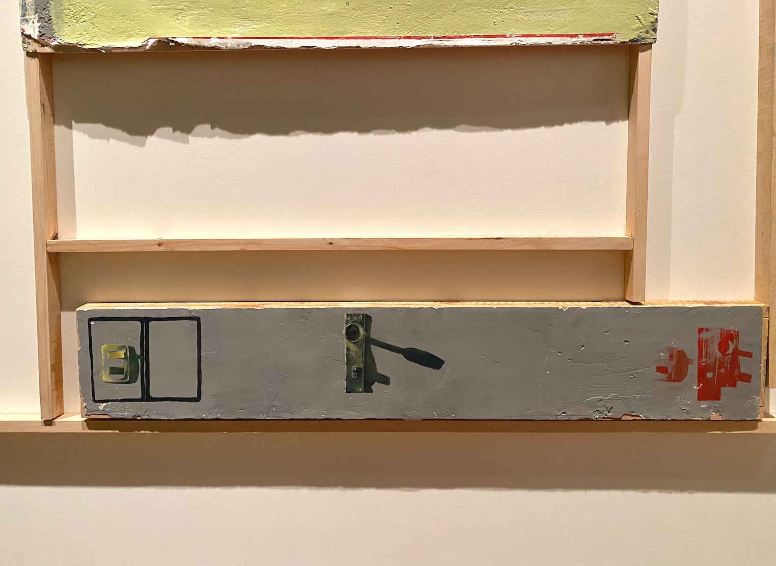 Tinta óleo, transferência de imagem, serigrafia, aquarela e grafite sobre resto de placa de cenário