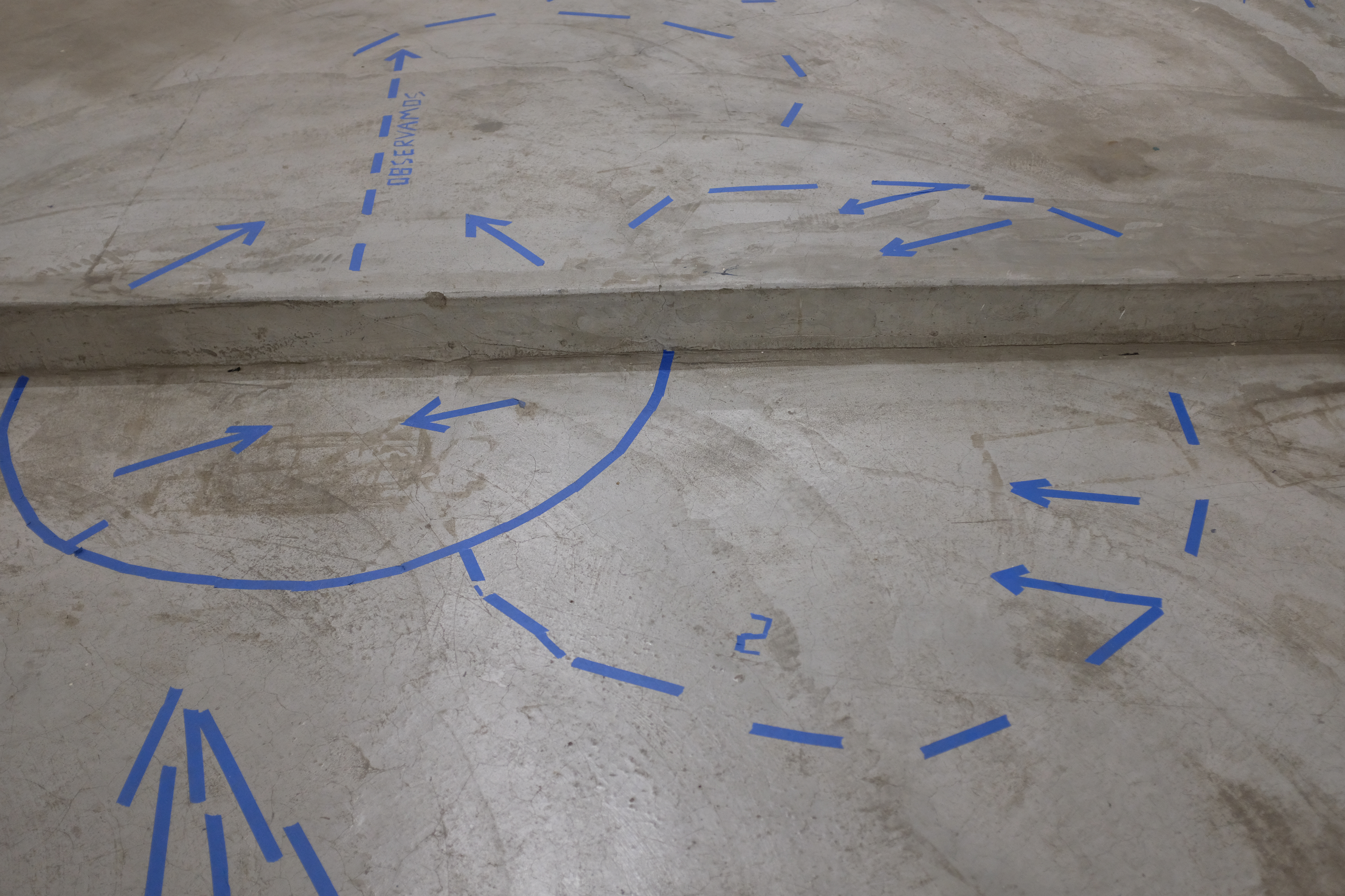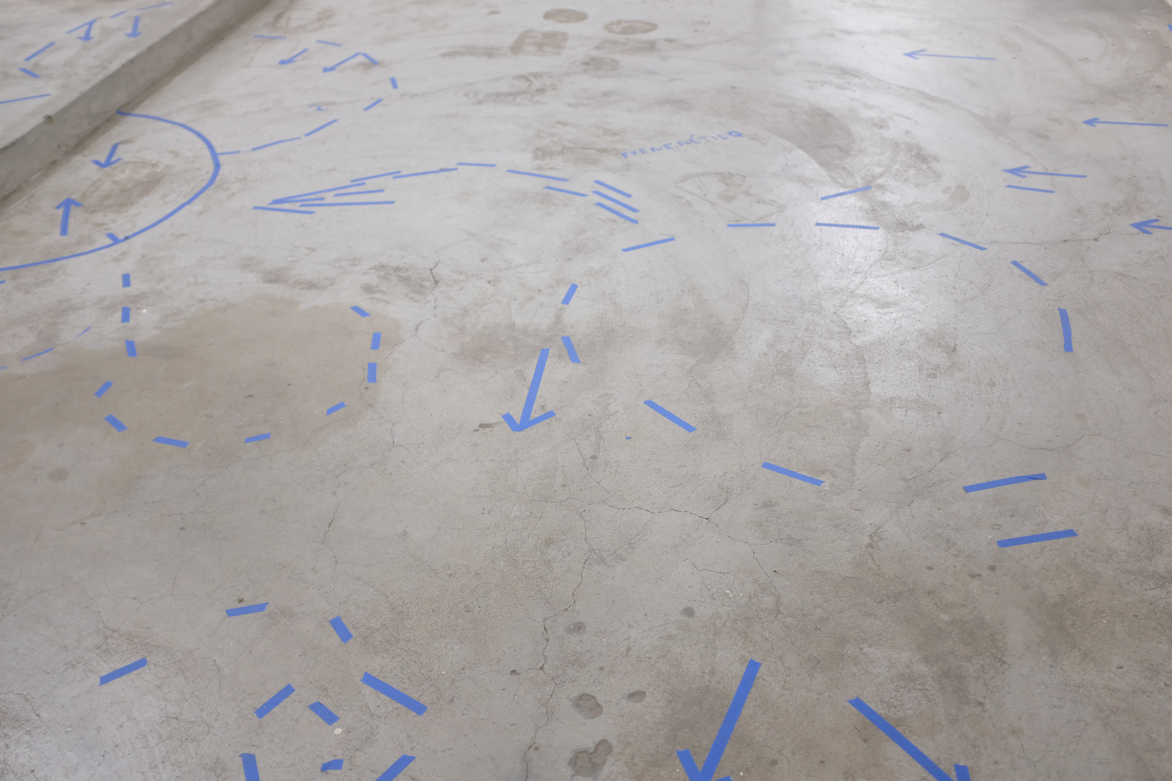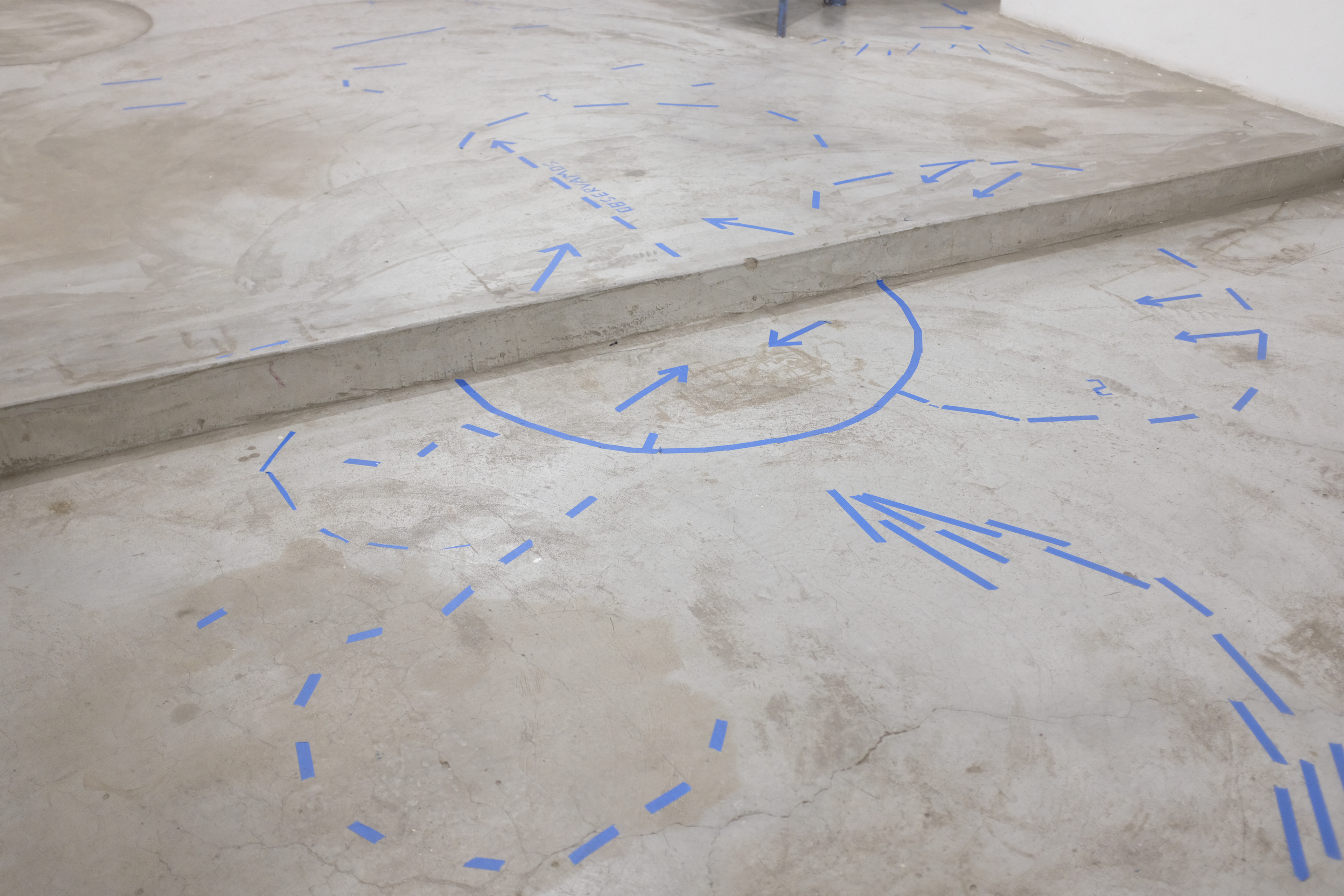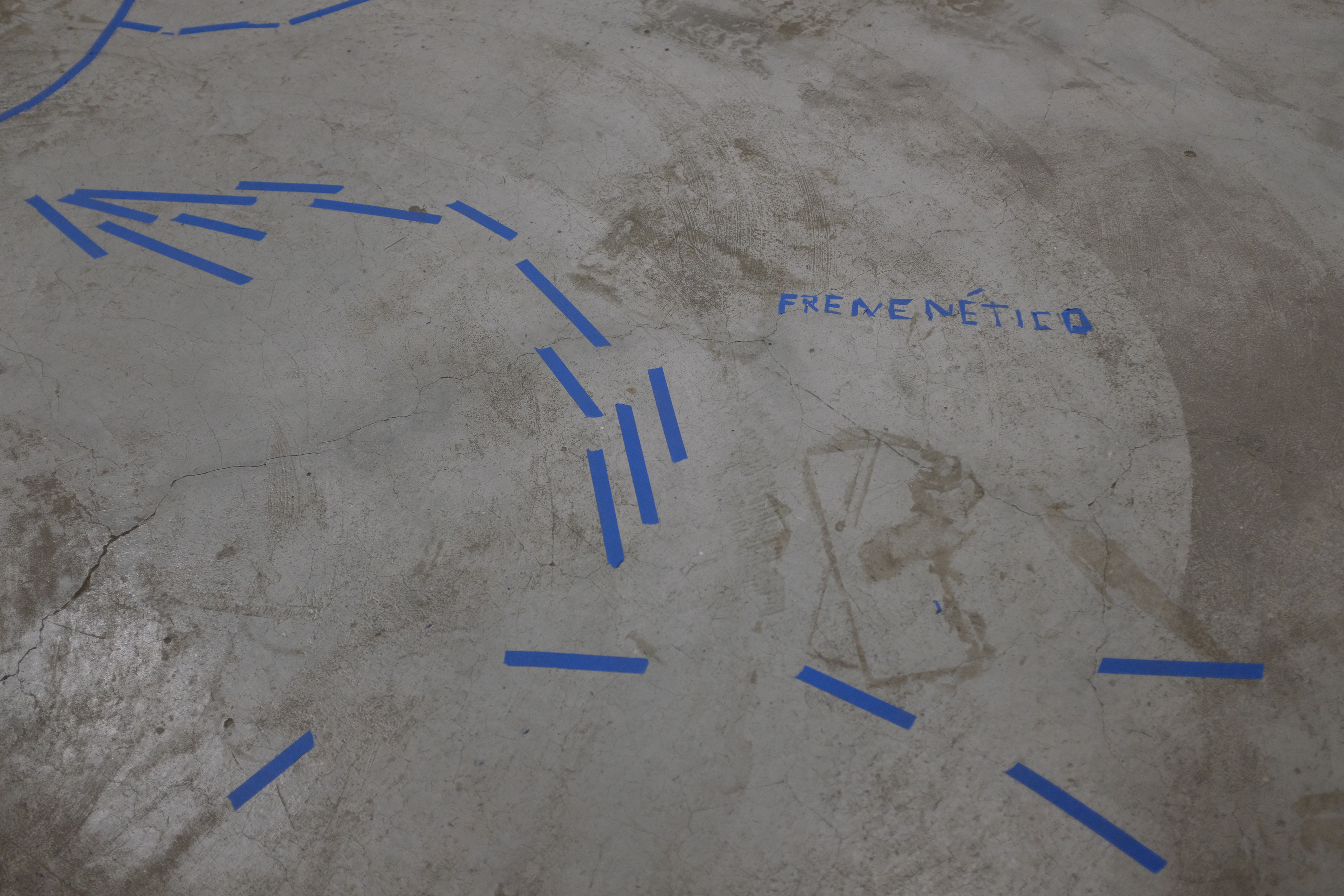 Nesta ação, utilizo de uma fita adesiva azul para traçar no chão e nas paredes certos desenhos em reação direta a agrupamentos de pessoas. Observando as relações e conversas que se desenrolam no espaço, aproximo-me dos grupos e – enquanto ainda dialogam – delimito esquemas, palavras, desenhos, comparação numeral e arquitetônica que transitam entre o descritivo e o fabulatório.