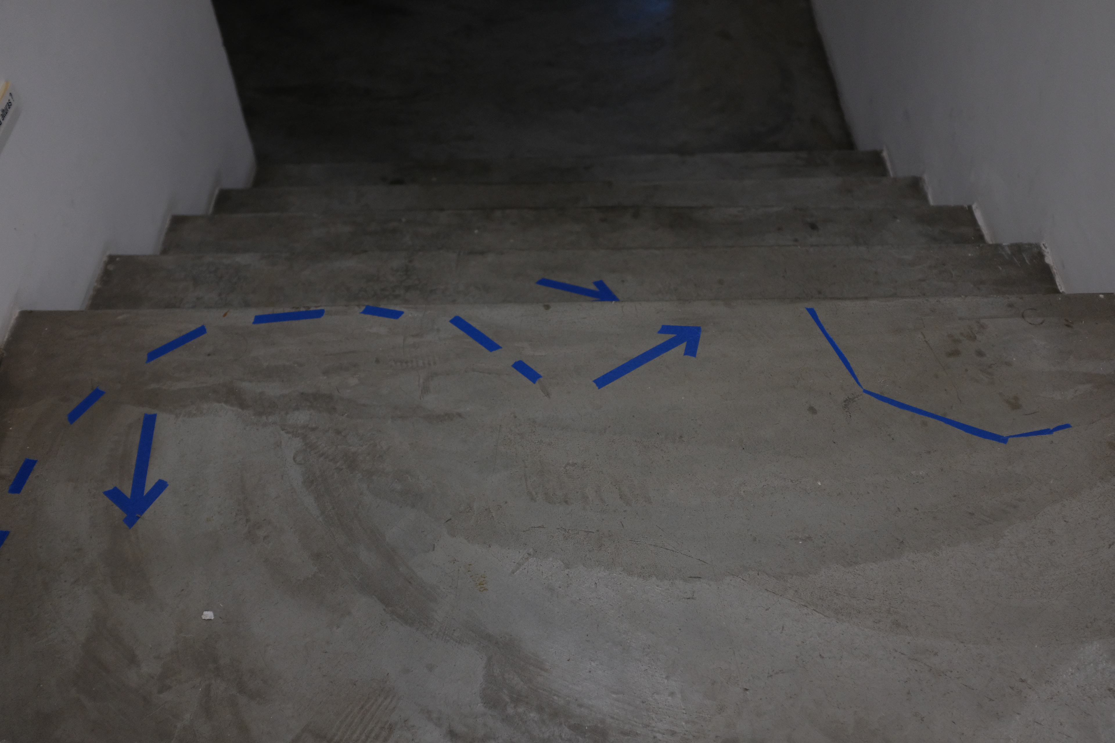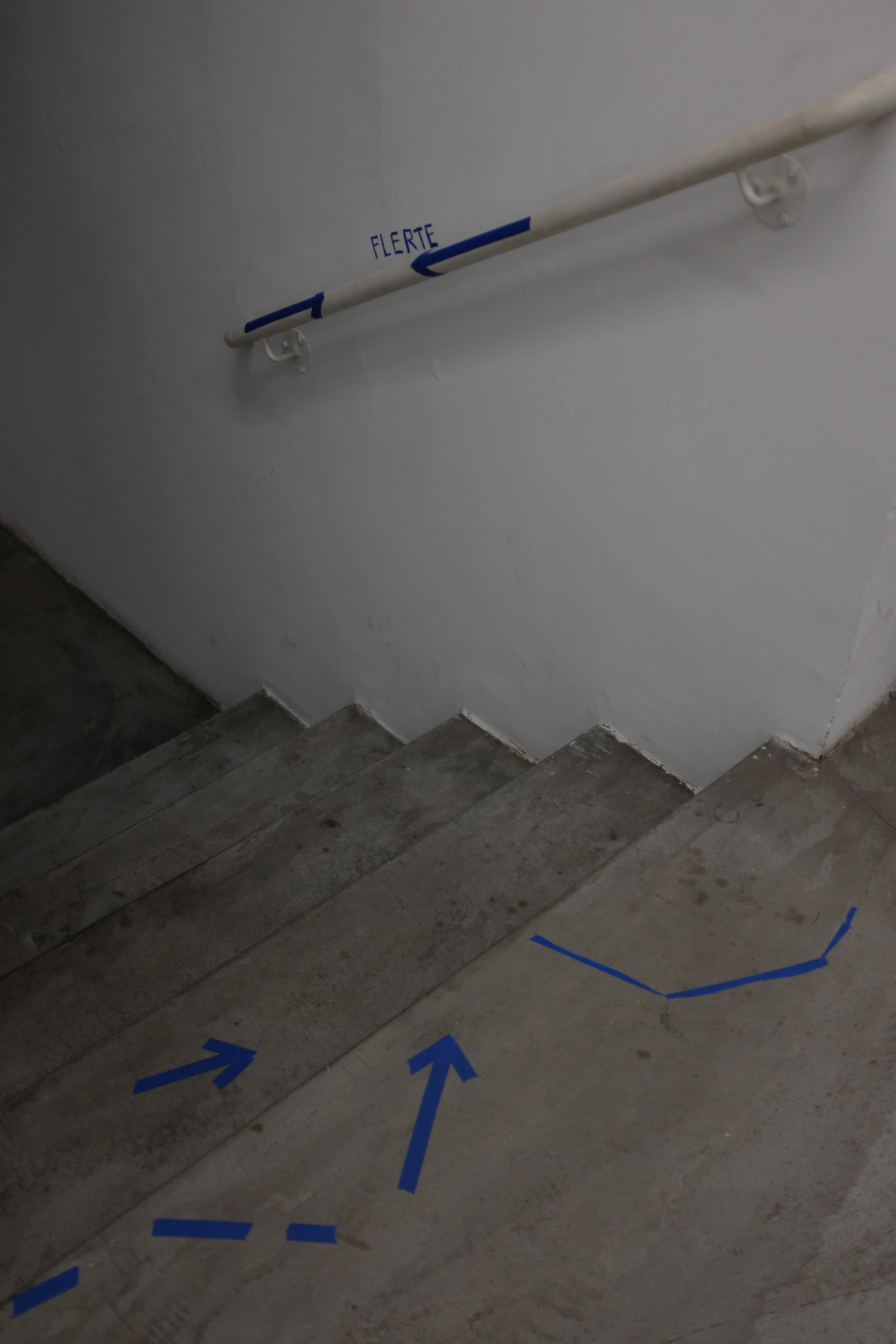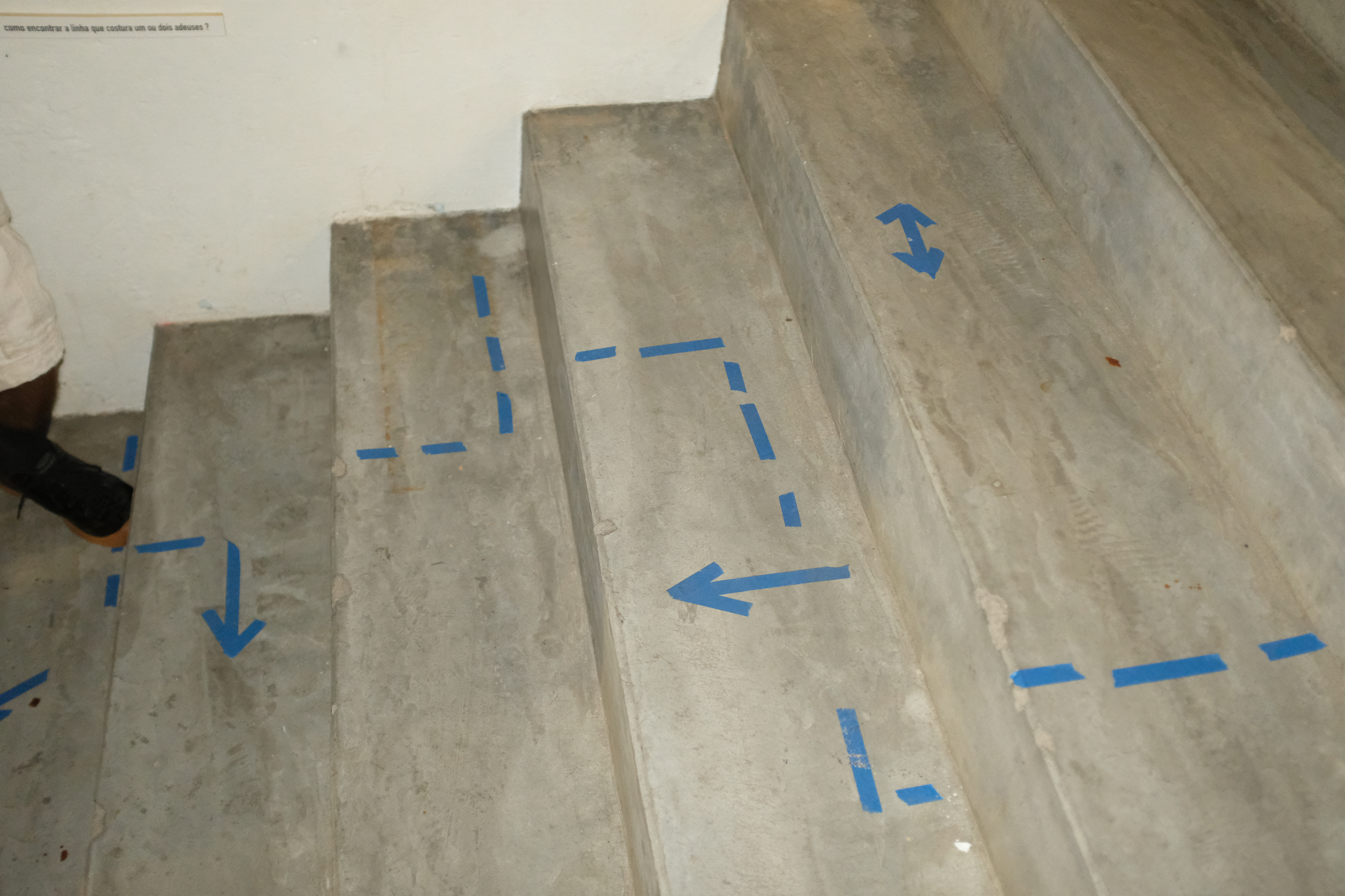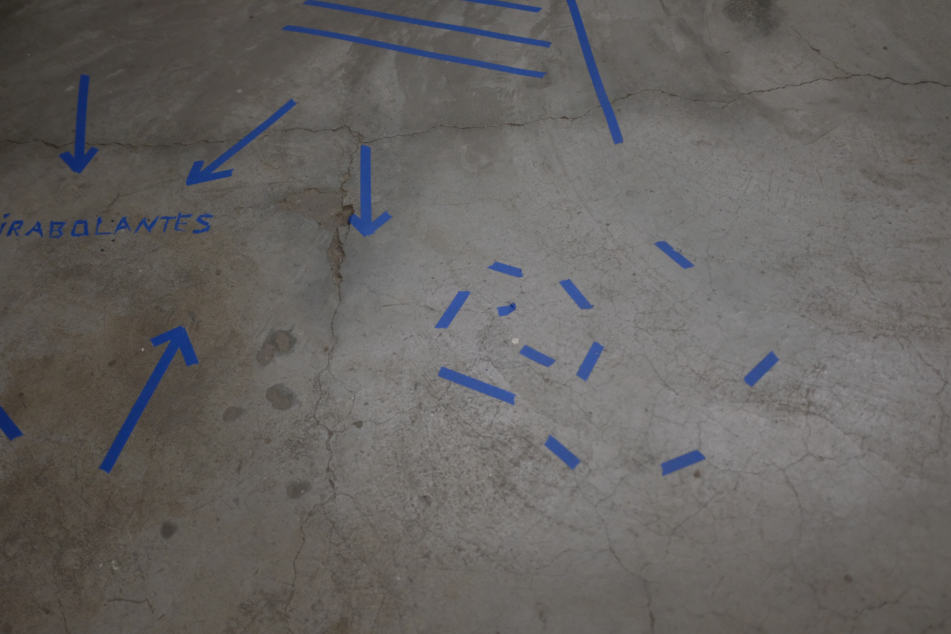 Nesta ação, utilizo de uma fita adesiva azul para traçar no chão e nas paredes certos desenhos em reação direta a agrupamentos de pessoas. Observando as relações e conversas que se desenrolam no espaço, aproximo-me dos grupos e – enquanto ainda dialogam – delimito esquemas, palavras, desenhos, comparação numeral e arquitetônica que transitam entre o descritivo e o fabulatório.