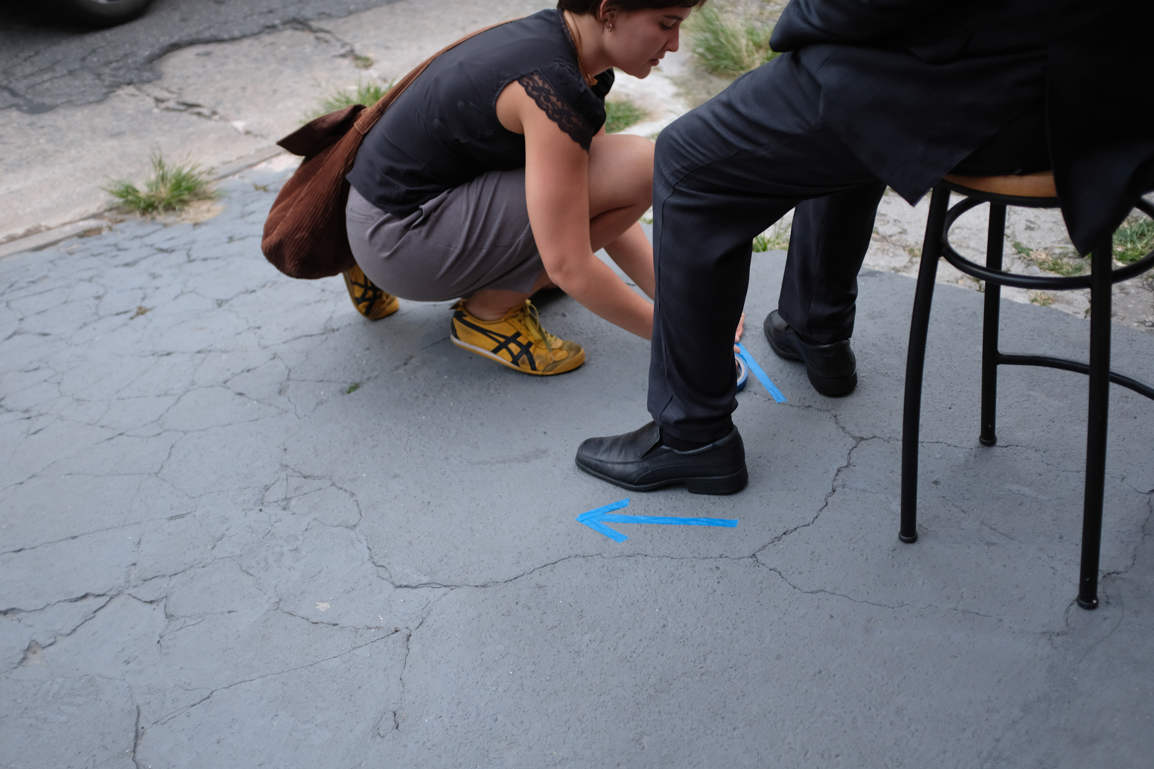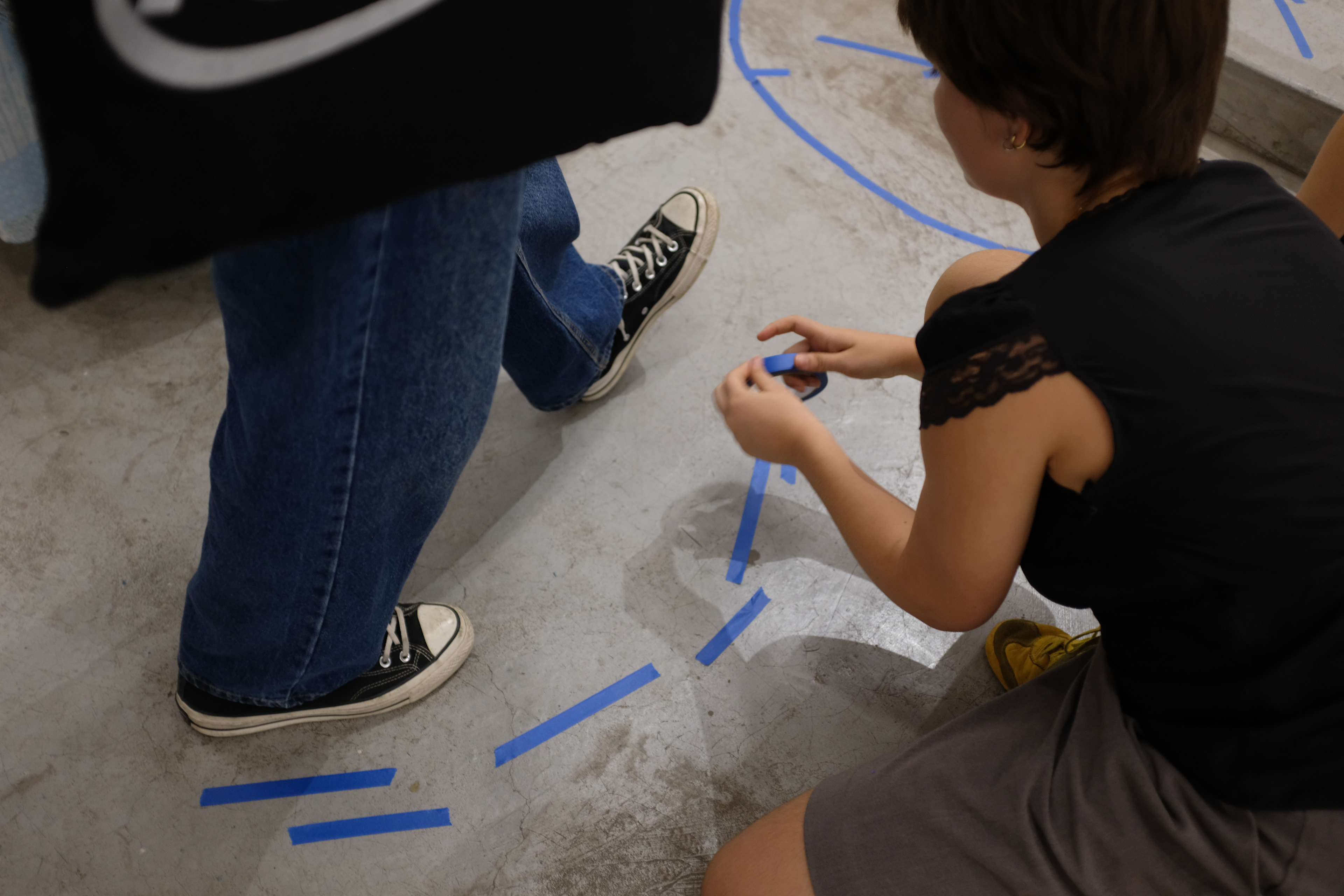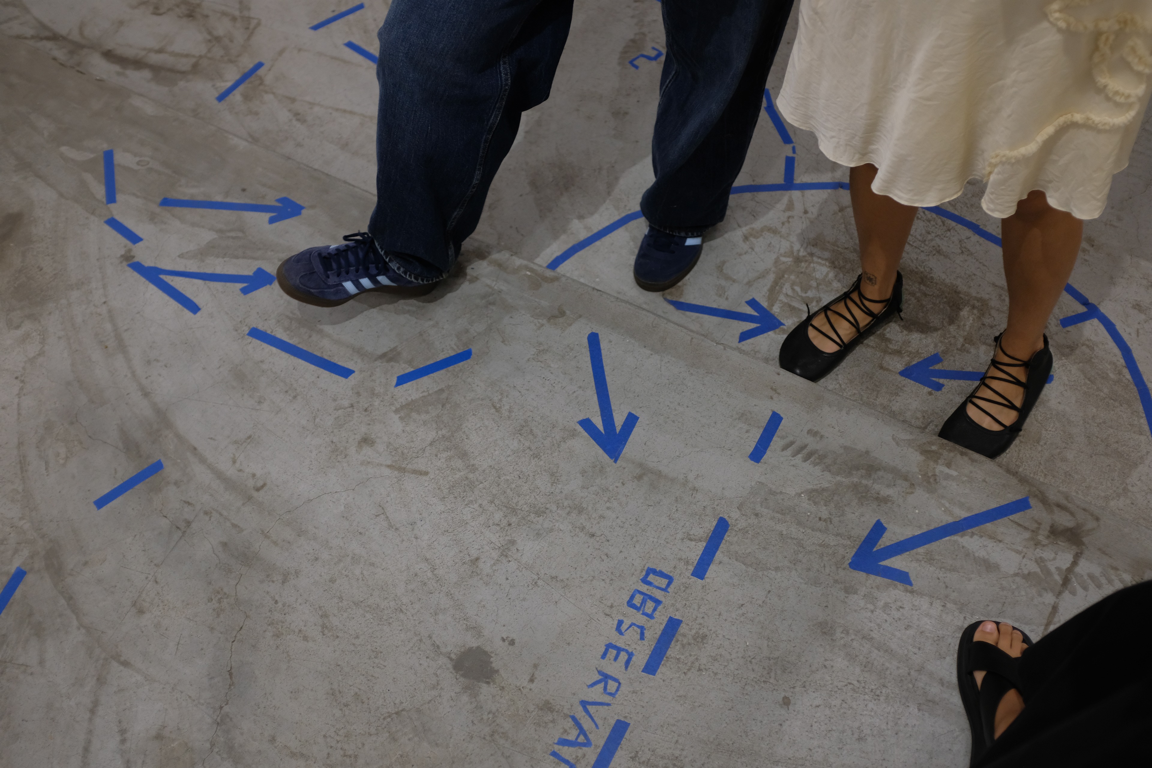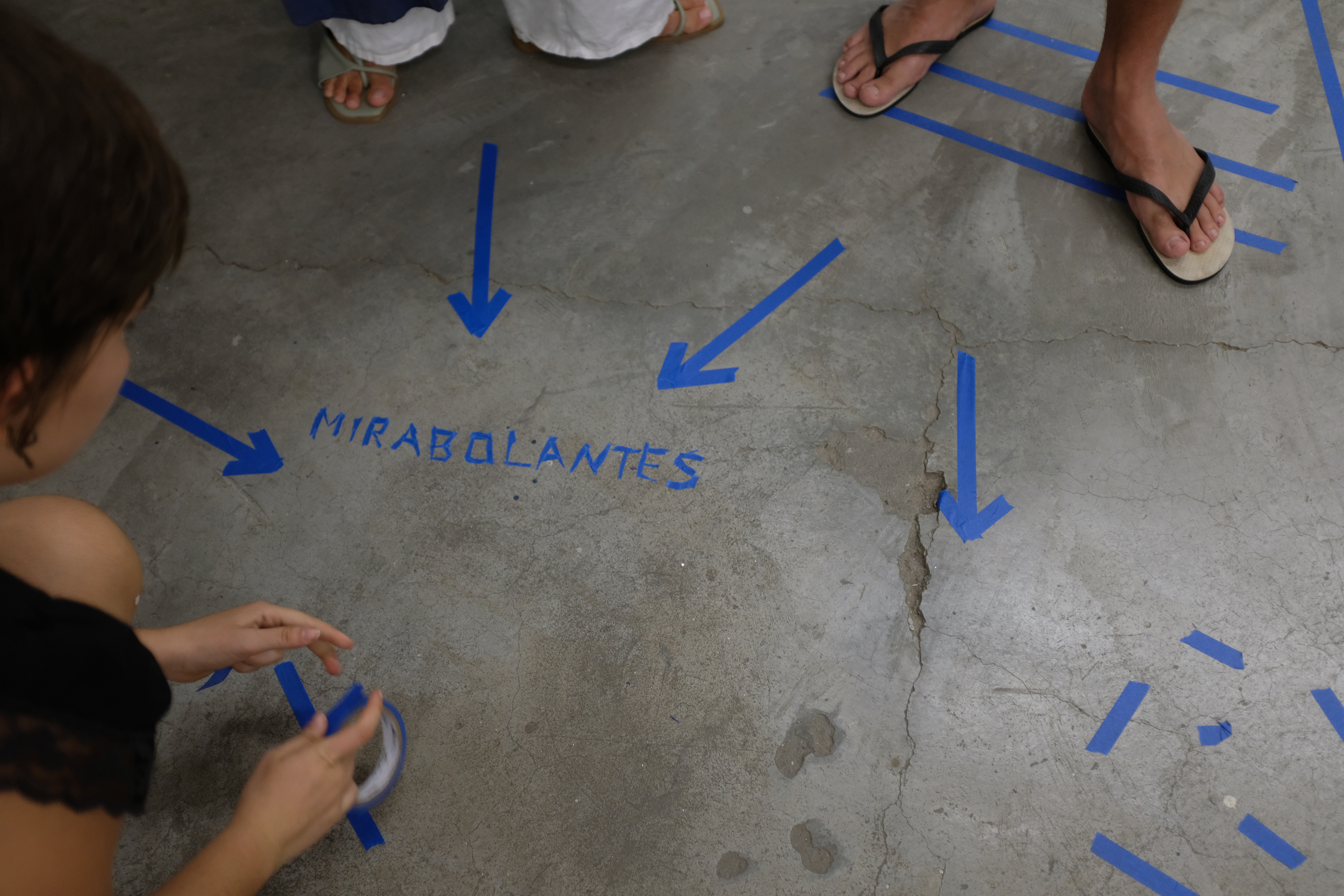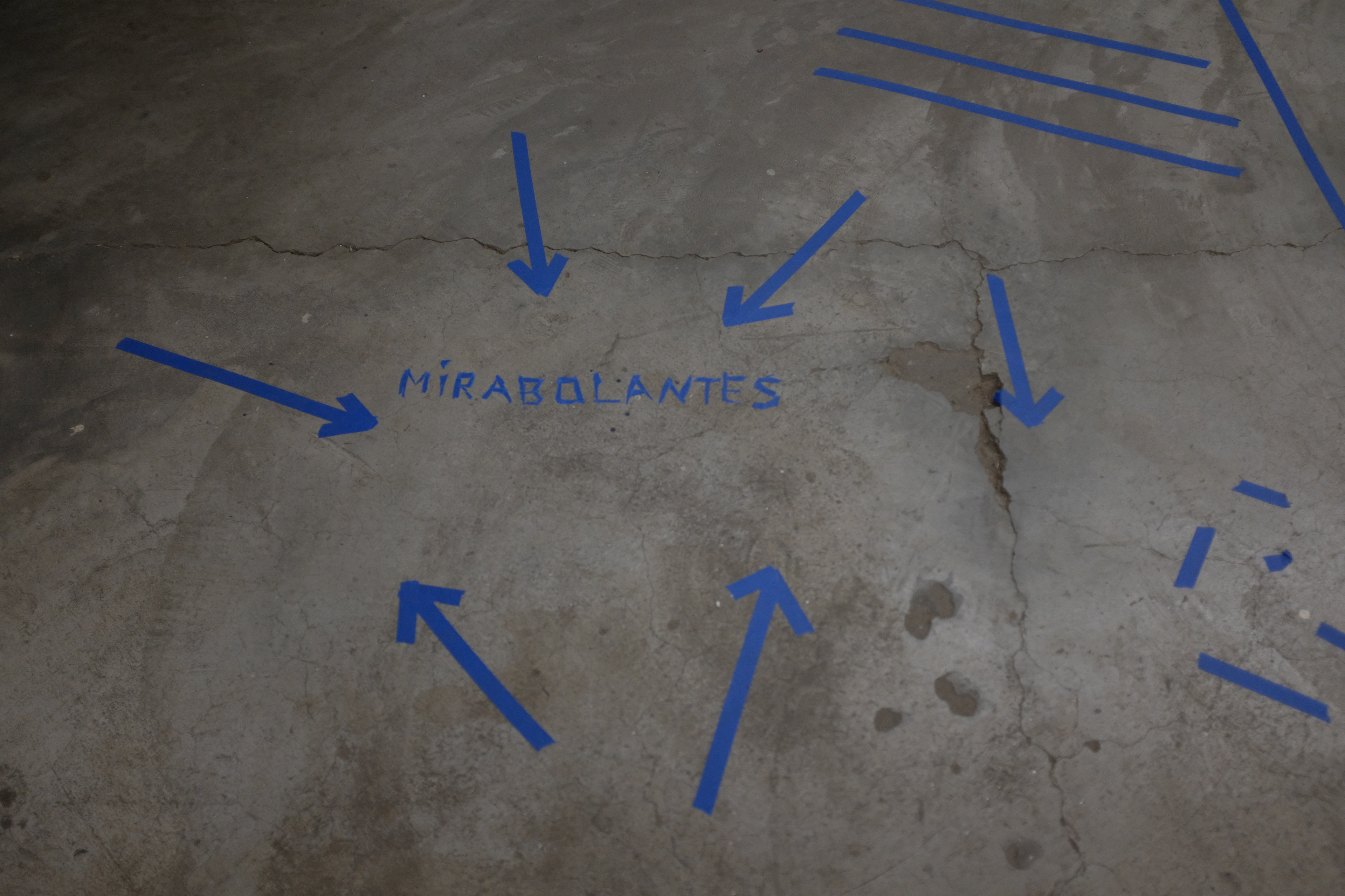 Nesta ação, utilizo de uma fita adesiva azul para traçar no chão e nas paredes certos desenhos em reação direta a agrupamentos de pessoas. Observando as relações e conversas que se desenrolam no espaço, aproximo-me dos grupos e – enquanto ainda dialogam – delimito esquemas, palavras, desenhos, comparação numeral e arquitetônica que transitam entre o descritivo e o fabulatório.