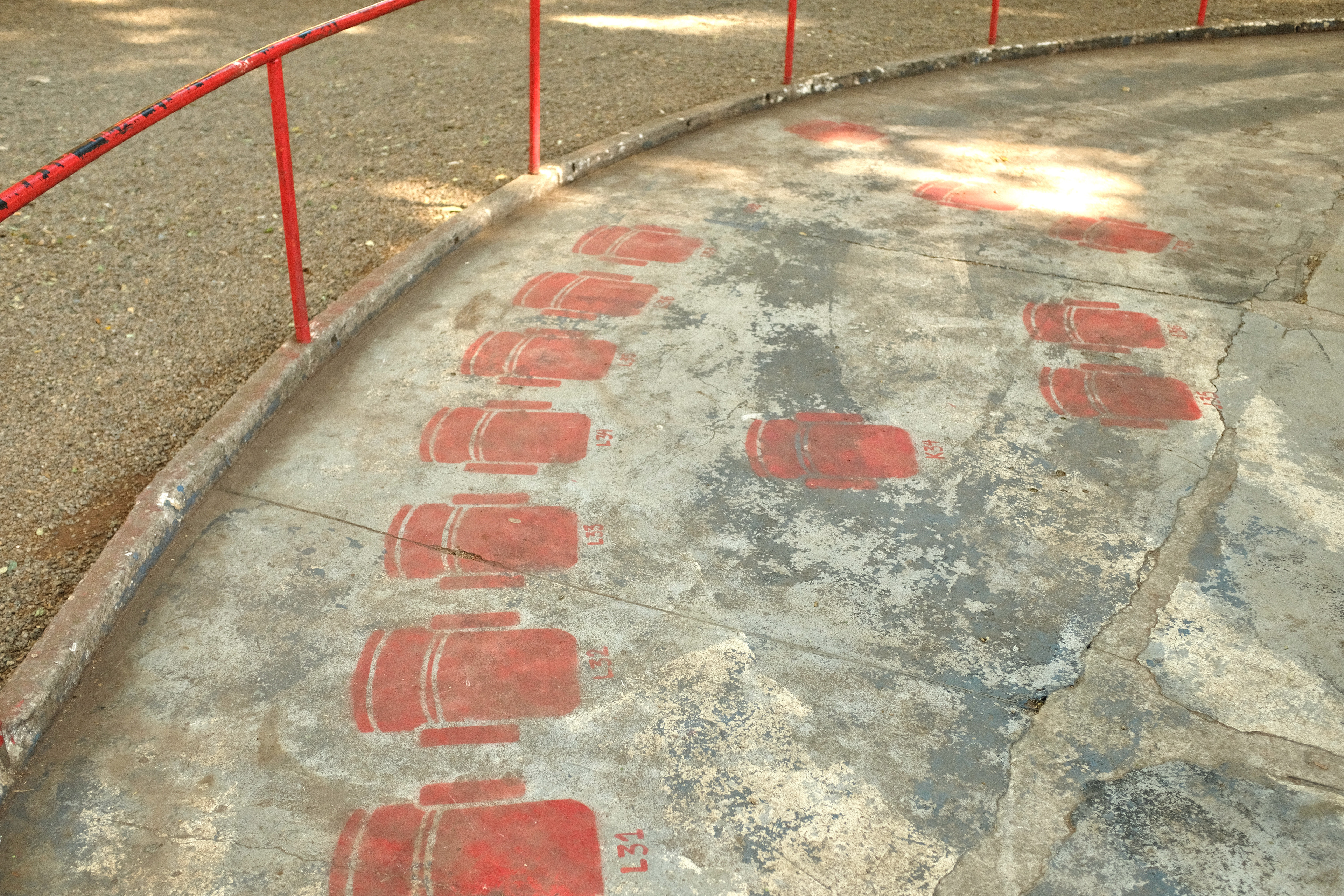 Com stencils, pintamos alguns assentos de plateia em volta da quadra, como se o palco ainda estivesse ali. Realizamos uma forma de brincadeira, tal como um jogo de amarelinha, que desenha ou tenta reinventar esse teatro apagado.